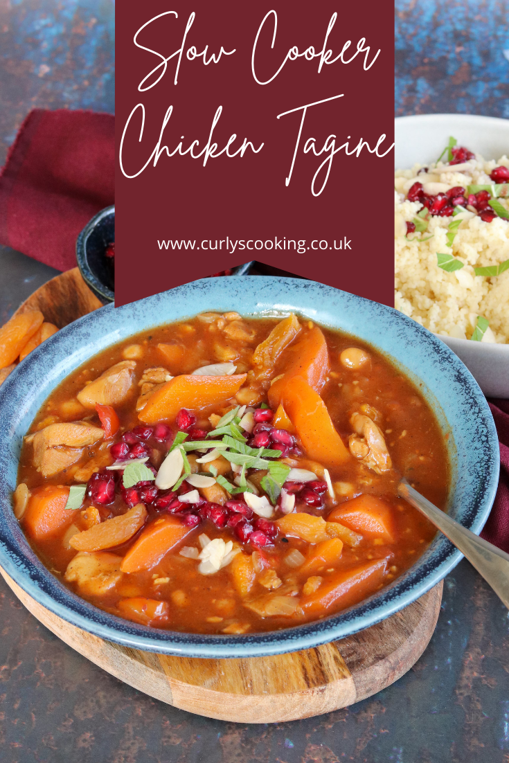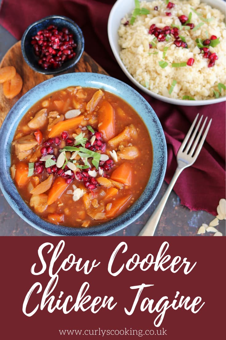 I like to serve this Slow Cooker Chicken Tagine with some simple couscous. I then like to sprinkle the couscous and tagine with mint, flaked almonds and pomegranate seeds. These add some amazing crunch to the finished dish.